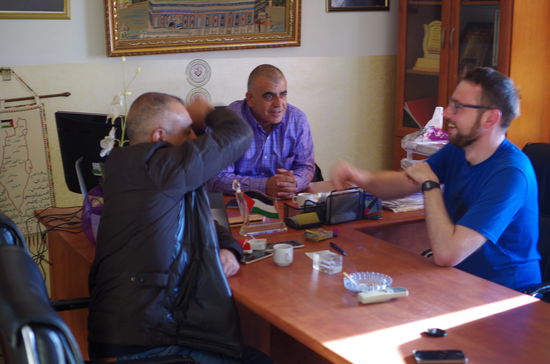 Meine Bekanntschaft führte mich durch die halbe Stadt, wir durchquerten einen Innenhof von dem eine schmale Gasse in einen Gebäudekomplex führte, an dessen Ende sich ein Fahrstuhl befand. Als ich aus dem Fahrstuhl ausstieg, befand ich mich in einem der Hauptbüros der Fatah, der einflussreichsten Partei im Westjordanland. Meine Bekanntschaft kannte sich in diesem Gebäude scheinbar aus, er führte mich direkt in das Büro von Morfaq Sehewel und stellte uns vor. Dieser ist ein Spitzenfunktionär innerhalb der Fatah in Ramallah. Erst im Laufe des Gesprächs wurde mir klar, dass die beiden die Reichweite meines Blogs – gelinde gesagt – etwas überschätzt hatten. Sie sahen die Möglichkeit für ihre Positionen in Deutschland zu werben. Ich zog es nicht ernsthaft in Betracht, dieses Missverständnis aus der Welt zu räumen, da ich das Büro aller Voraussicht nach schnell wieder hätte verlassen müssen. Die Chance, mit einem Menschen zu sprechen, der unmittelbar in den politischen Prozess eingebunden ist, wollte ich unbedingt nutzen. Bevor wir mit dem Gespräch beginnen konnten, mussten wir jedoch erst einmal einen Dolmetscher organisieren. Alles wirkte improvisiert und authentisch. Zwischenzeitlich gab es sogar einen zweiten Dolmetscher der per Telefon aus Deutschland zugeschaltet war. Es war ein Freund meines Gesprächspartners, der sich zurzeit in Oldenburg und Wittmund (Ostfriesland) aufhält. Selbstverständlich konnte ich mir die Gelegenheit nicht entgehen lassen, unseren Telefongast mit einem kräftigen „Moin“ zu begrüßen.