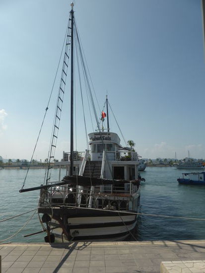 Ich vergesse mal wieder etwas Entscheidendes, nämlich meinen Rucksack - Altersheimer läßt grüßen. Die Mannschaft wartet, da ich zurück laufe, man hätte den Rucksack auch direkt aufs Schiff gehievt. Dann muß ich in aller Eile noch eine Schwimmweste anlegen und nach gut 100 m Bootsfahrt können wir an Bord. Dort gibt es zunächst mal einen Saft zur Begrüßung und ein Einweisung ins Programm, das allerdings auch auf dem Zimmer ausliegt.