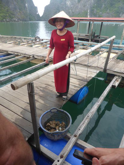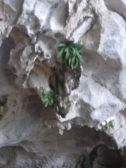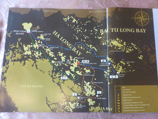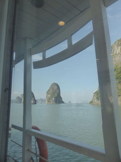 "Viele der steil aus dem Wasser empor ragenden, skurril geformten Felsen weisen Hohlräume auf und sind durchzogen von gigantischen Grotten. Im Innern mancher Inseln erstrecken sich Seen, kreisrund wie ein Auge und eingefasst von schroffen Felswänden. Kein Wunder, dass die Vietnamesen die malerischen Klippen, Riffs, Felstore, Hohler und Grotten ihrer Bucht seit Alters her nur als Schildkröte, Büffel, Elefant. Fledermaus, Kämpfende Hähne, Essstäbchen, Griffel oder Dschunkensegel kennen. Denn genauso sehen sie aus." (s.o.)