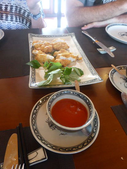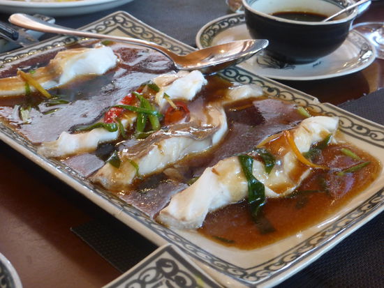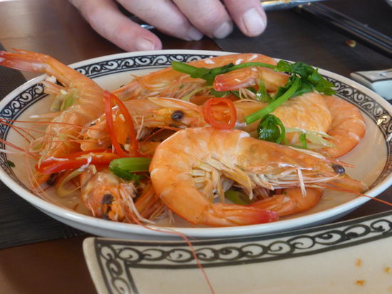 13.30 Uhr ist Lunch angesagt, unsere Tischnachbarn sind Kanadier aus Vancover Island, sie bestellen sofort eine 'bottle of chardonnay', wir bleiben wegen des Durstes bei Bier. Es gibt eine seafood Soup, Shrimps, vegetable salad, Chicken, Fish mit dunkler Soße, eine Art Calamares, Gemüse, Reis und schließlich eine Obstkaltschale.