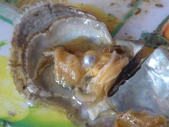 Danach heißt es raus auf das Beiboot, um eine Perlenfarm zu besuchen. Es ist interessant, wie die Menschen, der Auster eine kleine Kugel (aus ihrem eigenen Panzer - dem Perlmutt) operativ einpflanzen. Etwa 50% gehen ein, die anderen bilden je nach Länge ( bis zu 8 Jahren) kleinere oder ganz große Perlen aus. Zum Schluß wird bei einer kleinen Muschel nachgeschaut, zu welchen 50% sie gehört und siehe da es ist ein kleine Perle inmitten des Muschelfleisches. Qualität Mittel – die Preise im obligatorischen Shop gehen für eine nicht allzu große Halskette bis zu 18000 $.