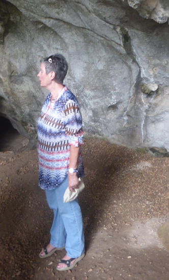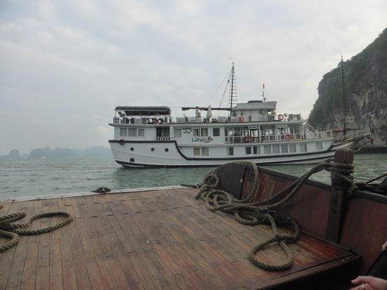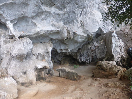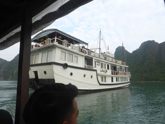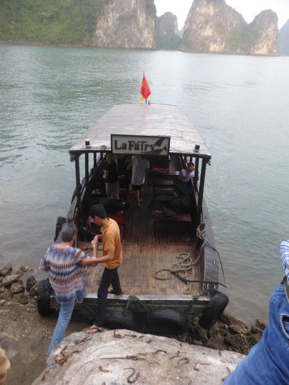 Zurück im Beiboot fahren wir zu einer kleinen Tropfsteinhöhle, an der man so in die Höhe steigen, dass man in beide Richtungen schauen kann. der name der Grotte: Dong Me Cung