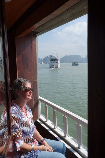 Dann fährt unser Schiff allmählich zum Ankerplatz, wo wir dann zum ersten mal eine große Anzahl dieser Schiffe sehen. An Bord gibt es Obst und Kekse. Aber wir wollen danach auch noch unseren Balkon genießen. Aber von Boot an Boot kann auch hier nicht die Rede sein. Ich würde sagen – Rufabstand! Und das ist nicht ‚beängstigend’ wie KnowHow schreibt.
