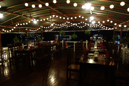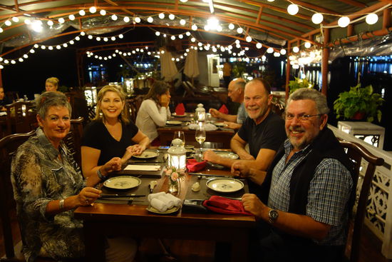 Um 19.00 Uhr erwartet uns nun das Dinner auf dem Sonnendeck. Die Temperaturen sind so, dass man spielend im Hemd speisen kann. Es erwartet uns demnach keine Höllennacht nach KnowHow. Wir unterhalten uns blendend mir dem kanadischen Paar, das schon beim Lunch an unserem Tisch saß. Da es dunkel ist, kann man auf dem Oberdeck natürlich nichts mehr sehen. Wir wählen einen Sauvignon Blanc aus Neuseeland zum Essen, das aber leider nicht so lecker ist wie heute Mittag. Es gibt wieder eine Suppe, danach eine Salat das folgende Rindfleisch ist zäh, der gebratene Gemüsepuffer nicht überwältigend – ich bin noch gesättigt von heute Mittag – und dann gibt es Austern (!), allerdings gefüllt und für Ulrike erschreckender Weise mit Erdnüssen, die sehr häufig in den Salaten auftauchen. – Cliff ißt keine Austern und Jackie überläßt mir die seinen, so komme ich immerhin auf fast ein halbes Dutzend, was danach folgt weiß ich nicht mehr genau, da ich mit den Austern das Dinner beende.