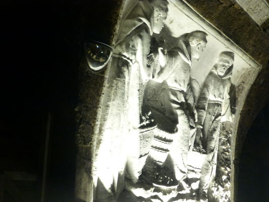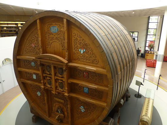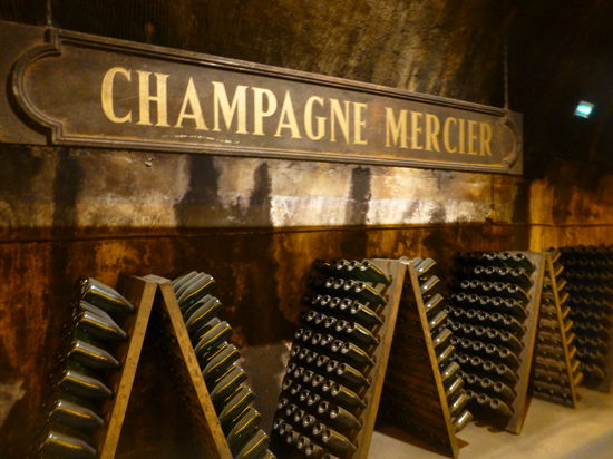 Ausgerüstet mit einem Audioguide in deutscher Sprache fahren wir nach einem nett aufgemachten Einführungsfilm mit einem Aufzug 30 Meter in die Tiefe. Hier sind die Kelleranlagen alle auf einer Ebene. Sie wurden in den Kalkfelsen gegraben und erstrecken sich auf über 18 Kilometer Stollen, Wege und Gänge. Wir müssen mit einem Zug durch die Anlage fahren, sehen die Lagerräume sowie kunstvolle Wandfriese. Nebenbei wird uns das Herstellungsverfahren und die Geschichte des Hauses erklärt. Eugène Mercier ließ unter anderem das seinerzeit größte Weinfass der Welt mit 1.600 Hektolitern Fassungsvermögen herstellen, das er mit 20 Ochsengespannen zur Weltausstellung 1889 nach Paris transportierte. Heute ist es in der Eingangshalle zu bestaunen.