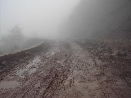 na dann nichts wie hoch und es beginnt gleich mit einer matschigen baustelle und der nebel begrenzt die sichtweite auf 15 meter. was weiss ich, was wir gesehen haetten, aber kaum oben angekommen (ich nehme an es war der Mount LIANG) bietet sich die gleiche schlammabfahrt wie am anfang des anstieges ... also erster gang, hinterradbremse, balancieren ... und schwitzen. durchschnittstempo? irgendwo bei 5-7 km/h.