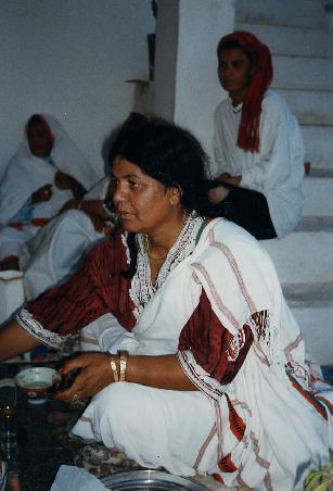 Der Tag verläuft ruhig bis zum späten Nachmittag: Es sind mehr Gäste als geplant gekommen, also müßen noch zwei Schafe geschlachtet und verkocht werden. Die Männer schlachten und die Frauen kochen.... allerdings nur das Essen für die Familie! Das Festessen kocht ein Mann! Mit folgender Begründung: Da die Frauen soviel mit Süßem zu tun hätten (der Braut, dem Honig usw) wären sie nicht mehr in Lage das Essen richtig abzuschmecken (es soll ja scharf sein)! Nach und nach treffen wieder viele Gäste ein und es sind auffallend viele junge Mädchen darunter! Nach Sonnenuntergang und nach dem Essen, schnappen sich ein paar der unverheirateten Frauen die Darboukas und fangen vor Nashouas Tür zu singen an. Sie rufen die Braut. Und sie wollen mit der Braut durch das Dorf ziehen. Jedem unverheirateten Mädchen bringe es Glück, wenn es mit der jungfräulichen Braut von Haus zu Haus zieht. Unter Singen und Trommeln geht es mit der -nachwievor - tiefverschleierten Braut in erste Nachbarshaus. Die Nachbarin scheucht alle evt. vorhandenen männlichen Wesen energisch hinaus und dann bringt sie uns Getränke und Feigen. Es werden drei ziemlich anzügliche Lieder gesungen und dann geht es ins nächste Haus. Als wir im dritten Haus ankamen hören wir von draussen Mezouid-Musik und Männergesang! Wo sind die? Und was wollen sie? Sie kommen im Auftrag des Ehemannes und sollen die Braut verlocken wieder nach Hause zu kommen...und zwar mit Geschenken! Es sind viele Geschenke nötig, um Nashoua zu überzeugen, daß es vielleicht doch nicht ganz so schlecht ist, dorthin zurückzukehren. Teppiche, Stoffe, Kleider und vor allem Goldschmuck! Die Geschenke, die eine Braut erhält und auch ihre Aussteuer gehören ausschließlich ihr. Alles wird fein säuberlich erfaßt und am nächsten Tag auf dem Amt den Heiratsurkunden beigelegt, damit sie im Fall der Fälle versorgt ist.