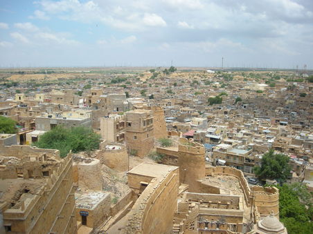 Nach einer guten Dusche haben wir uns auf die Socken gemacht um Jaisalmer zu entdecken. Das ist eine Stadt mitten in der Tharwueste mit einem riesigen Fort im Herzen der Stadt. Das Fort ist bewohnt und heute befinden sich viele Hotels und Restaurants darin. Man sollte die Hotels im Fort jedoch als Turi nicht bewohnen, da das Fort bedroht ist und der Sandstein sich durch die Abwasser langsam aufloest (es gibt kein richtiges Leitungssystem). Aus dem Grund haben wir uns fuer die weniger romantische Variante entschieden und ein Hotel ausserhalb des Forts genommen. Wir haben uns gleich nach Kamelsafaris erkundigt und eine 3-Tagestour gebucht. Wir sind durch die Gassen des Forts gestreift, haben einen leckeren Mangosaft getrunken. Ploetzlich hat es geblitzt und gedonnert und wir haben uns ganz schnell aufgemacht Richtung Hotel, weil wir dachten, dass es gleich in Kuebeln regnen wird, darauf warten wir aber heute noch , war wohl nur eine Drohung. Eine Abkuehlung wuerde hier richtig gut tun, uns laeuft der Schweiss nur so runter! Wir rennen sogar schon wie alte Omas mit einem Schweisstuch rum, jederzeit bereit, uns den Schweiss vom Gesicht zu wischen . Es sind etwa 43 Grad hier...!