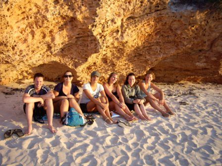 Eric, Anna, Maria, Anna, me, Carine und Nicola hinter der Kamera beim Sonnenuntergang am Beach