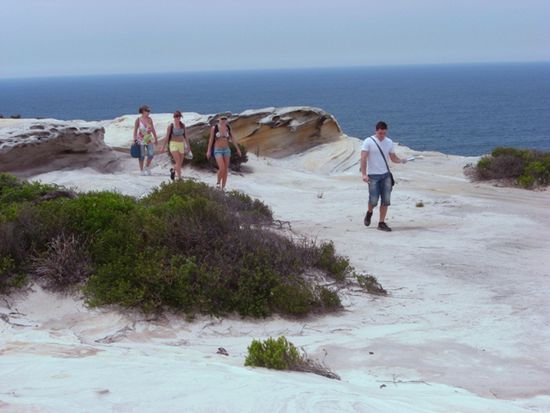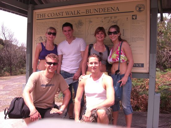 Der komplette Coast Track von Bundeena nach Otford ist 26km lang. Wir entschieden uns fuer den Marley Trail, der der Karte zufolge ca. 6,5km lang sein sollte, also annehmbar für eine Gruppe wie wir Der Track wird als "medium difficulty" eingestuft. Erschwert wird er lediglich durch die Hitze bzw. stehende Luft und die 1000 Fliegen, welche uns bis nach Sydney zurück begleiteten. Während unserer Wanderung hatten wir aber noch andere tierische Begegnungen, u.a. eine Schlange und eine Eidechse.