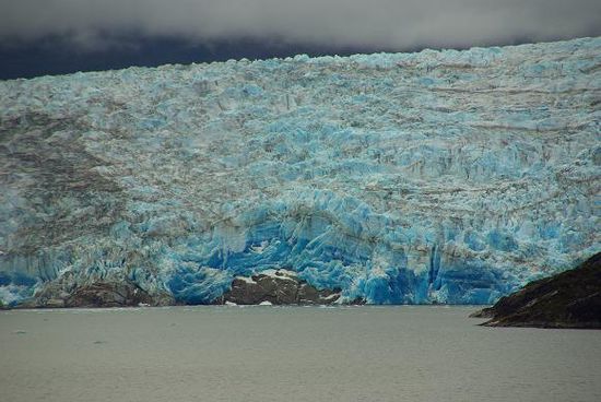 Am Nachmittag gabs dann eine kurze Versammlung, bei der uns mitgeteilt wurde, dass es doch noch einen kurzen Abstecher zu einem Gletscher gibt. Zwar nicht zu den grossen wie Pio XI oder Amalia, aber immerhin. Der Gletscher hiess 'Iceberg', schon ein etwas seltsamer Name in Suedamerika, aber mangels einer guten Karte mussten wir das unseren Animateuren am Schiff wohl glauben. Und es war dann auch recht interessant, obwohl man nicht allzu nah an den Gletscher herankam. Die dunkelblau Farbe des Eises war aber gigantisch.