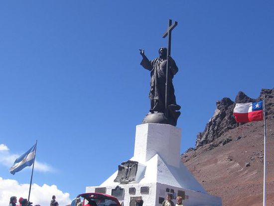 Neben dem Wein gibts aber noch eine ganz andere Atraktion in Mendoza, und das sind die Anden mit dem hoechsten Gipfel Amerikas, dem Aconcagua. Also auf in einen Tourbus Richtung 'alta montaña'. Man faehrt relativ viel in der Gegend herum, aber der Trip zahlt sich auf jeden Fall aus. Man kommt bis zur chilenisch-argentinischen Grenze mit der Statue Christo Redentor auf ca. 3800 Meter Seehoehe, und der Ausblick von dort ist fantastisch, Berge und Taeler soweit das Auge reicht.