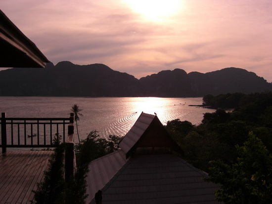 Tja, jetzt simma also auf Koh Phi Phi. Unsere erste Bleibe hatten wir ja noch in Krabi gebucht, was auch wunderbar geklappt hat. Nachdem das Buchstabieren am Telefon schon mal gewaltig misslungen ist (mein Nachname wurde ziemlich entstellt, "Schmibs" kam dann dabei raus...) hamm wir einfach auch "Tom" reserviert. Und so kam es dann dass tatsaechlich ein netter thailaendischer Longboatfahrer mit einem Schild "Tom" auf uns gewartet hat und uns kostenlos zum Longbeach gefahren hat. Angekommen mussten wir dann eine ziemlich lange Treppe hinaufsteigen, da das Resort auf einem Huegel lag. Wieder mal sehr schweisstreibend, aber die Aussicht bzw. der Blick ueber die komplette Bucht und zur Schwesterinsel Koh Phi Phi Leh hat dies auf jedenfall entschaedigt.