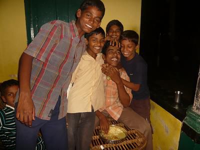 Prakash, der Junge in blau, der mich auf dem oberem Bild umarmt, ist erst seit 2 Wochen im Waisenhaus. Seine Mutter hat sich vor seinen Augen umgebracht und der Vater kann sich nicht um ihn kuemmern.