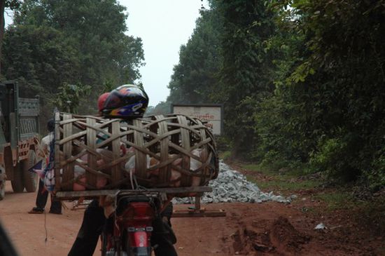 Es gibt neue Gesetze; Helmpflicht fuer Motofahrer, nur 2 Mitfahrer, Fuehrerschein. Diese Gesetze sind aber noch nicht bis zum Mann auf der Strasse durchgedrungen. Also fahren weiter Vater, Mutter + 2-4 Kinder auf einem Moto. Man hat den Eindruck, die Kleinen werden auf dem Moto gross, was dann zur Folge hat, dass die Maedchen, wenn sie gross sind, selbstverstaendlich seitlich auf dem Ruecksitz sitzen, die Beine grazil uebeinandergeschlagen, die Flip Flops bombenfest am zierlichen Fuesschen und keine Bodenwelle oder kein Schlagloch gefaehrdet ihren Sitz.