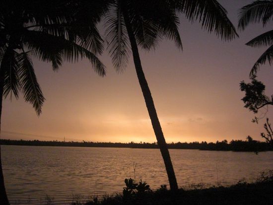 Alle Touristen die nach Kochi kommen tun das auch wegen der Backwaters (ein riesiges Netz von Wasserstrassen). Anschauen kann man sich die in verschiedenen Varianten. Wir haben uns für die 21 Stunden Hausbootvariante entschieden (wir beide, ein Hausboot und drei Leute zum Boot steuern und kochen). Es gibt auf so einem Hausboot jede Menge zu tun: relaxen, schauen, Fisch, Garnelen und andere indische Köstlichkeiten geniessen, von einem Liegeplatz zum nächsten wandern und dazwischen ein paar schöne Fotos schießen, wie zum Beispiel dieses da: