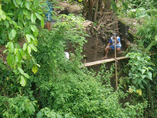 Vis-a-vis unserer hinteren Terrasse in Ubud wird eine Stützmauer gebaut, und zwar eine bereits existierende muss erhöht werden. Ein interessantes Beispiel balinesischer Baukunst im Jahre 2010. Diese Mauer soll ein weiteres Abgleiten des Bodens den steilen Hang zum Fluss hinunter verhindern. Technische Hilfsmittel gibt es keine, denn Arbeitskräfte in Bali sind bei einem Durchschnittseinkommen der Bevölkerung von $2 pro Tag äusserst günstig zu bekommen.