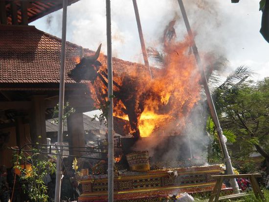 Wenn in Bali jemand stirbt hat er (oder sie) ganz einfach seinen Lebenszyklus beendet. Das will nicht heissen, dass man nicht um den Verstorbenen trauert, aber die Balinesen sind überzeugt, dass der Verstorbene zurückkehren und ein neues Leben beginnen wird. Die eigentliche Kremation des Körpers erlaubt es dem Geist des Verstorbenen, den inzwischen unnütz gewordenen "Behälter" zu verlassen. Nur Personen von hohem Stand wie Priestern, Mitgliedern von königlichen und fürstlichen Familien sowie hohen Würdenträgern ist eine individuelle Kremation erlaubt. Alle anderen werden zwischen 3 minimal, und 10 Jahren maximal begraben und inzwischen wird eifrig für eine Massenverbrennung gespart, die alle 3 Jahre in jedem Dorf stattfindet. Die Gräber der Verstorbenen werden zu diesem Zweck exhumiert und die Knochen gelangen zur Verbrennung. Erst dann ist der Geist auch dieser Personen frei.