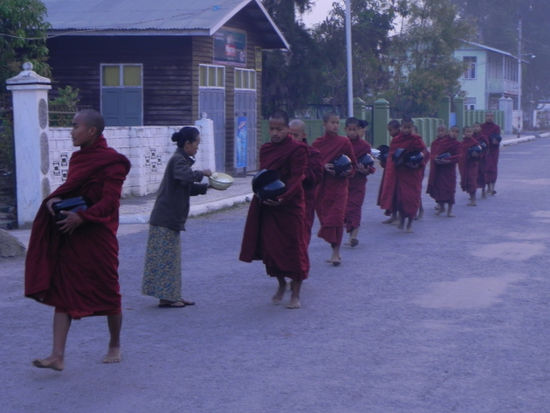 Bei unserem Marsch zum Pier sahen wir eine Reihe Mönche, die an jedem Haus mit flinken und geübten Handgriffen - patsch, patsch, patsch - einen Löffel Reis zur Morgenspeisung in ihre dargebotene Schüssel bekommen haben.