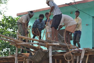 Am Bau. Sie heben Beton hoch, eine mühselige Arbeit. Dabei sind sie immer fröhlich und lachen ...