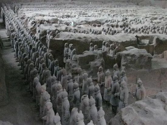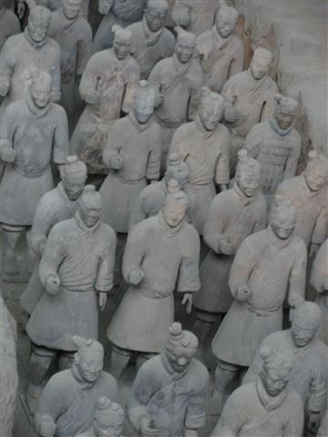 Heute Morgen fahren wir mit einem Stadtbus zurück zum Bahnhof, von wo aus die Buslinien 306 und 914 zu den Terrakotta-Kriegern starten. Nach etwa einer Stunde Fahrzeit können wir dort unsere Eintrittskarten kaufen (E= RMB 150) und wieder einmal staunend bewundern,wie sich der Eingangsbereich hier in den letzten 15 Jahren verändert hat - und weitere grosse Gebäude sind noch im Bau. Wir gehen zuerst einmal in das neu erbaute Museum - ein moderner Bau, der innen hallt und dröhnt wie eine Glocke. Man versuche sich einmal den Geräuschpegel vorzustellen, wenn 1000 laute Touristen von ihren Fremdenführen mit Mikrophon und Minilautsprecher gleichzeitig 'unterrichtet werden' und dabei keinerlei erkennbare Schalldämmung vorhanden ist - der Architekt gehört hier mal zur Hochsaison für 4 Wochen eingesperrt, vielleicht erinnert er sich dann wieder daran, was er eins über Akustik hätte lernen sollen.