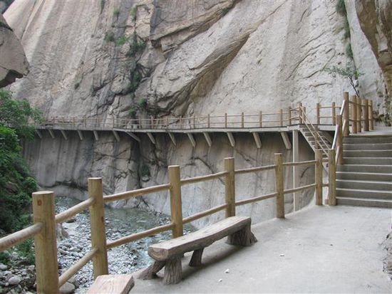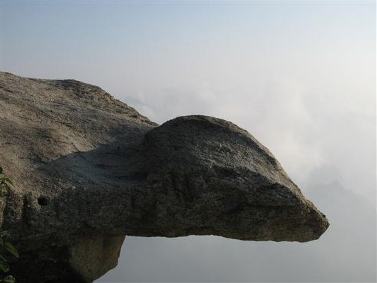 Hua Shan, einer der fünf heiligen Berge des Taoismus, ein von Gletschern geschliffener Granitklotz mit 5 Gipfeln (Nord-Ost-Süd-West und Mittelgipfel) und über 1000m hohe Steilwänden, sofort werden Erinnerungen an Yosemite wach. Hua Shan könnte das Paradies für Free-Climber sein, aber anscheinend wird dieser Sport hier nicht ausgeübt. Hua Shan hat den Ruf ein gefährlicher Berg zu sein, aber mittlerweile sind die kritischsten Stellen wie die 50m hohen senkrechten Aufstiege am Weg der Soldaten und der Aufstieg mit leichtem Überhang durch neu an den Fels betonierte Treppenhäuser entschärft, (Bilder dazu weiter unten) für den Abstieg zum Chess-Pavillion und zum Plank-Walk muss ein einfacher Brustgurt mit 2 Karabinerhaken (jedoch ohne Sturzbremse wie bei einem echten Klettersteigset) gemietet werden. Bei starken Regen wird der Berg gesperrt, bereits gelöste Eintrittskarten werden dann ggf. zurückerstattet. Um die Massen auf dem Berg besser zu verteilen ist derzeit eine zweite Seilbahn mit einer Bergstation zwischen Süd- und Westgipfel in Bau, Fertigstellung am 01.10.2012.