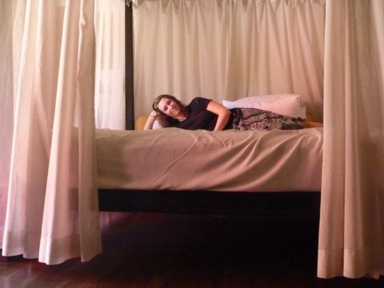 Mit einem kleinen Fluss, der an den Häuschen vorbeiführt, einem kleinen, aber einladenden Pool und einer sehr schönen Zimmereinrichtung. Das Bett war super. So stelle ich mir ein Prinzessinnenbett vor.