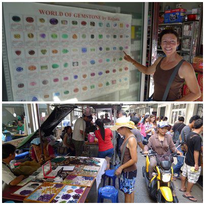 Chanthaburi, Stadt der Edelsteinhändler. In den Schaufenstern grosse Plakate mit Bildern der verschiedenen Steinchen. In den Strassen überall Läden oder einfach Tische aufgestellt wo die Kostbarkeiten gehandelt werden.