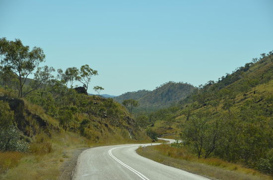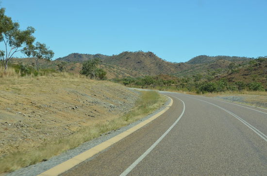 In einem Roadhouse wechseln wir nach 180 Kilometern den Platz. Das Roadhouse ist ein richtiger Einkaufsort für Outback-Touristen. Es stehen viele Allrad-Fahrzeuge draussen und die Leute füllen Tank und Proviant. Auch wir geniessen hier eine Tasse Kaffe, dann gehts weiter. Langsam verlassen wir die Hochplateaus und der Highway schraubt sich wieder in tiefere Gefilde. Des öftern überqueren wir auch Flüsse, die Wasser führen. Langsam gelangen wir wieder in grössere Ebenen hinein, die am Horizont von wüstenhaften Gebirgen eingerahmt werden. Es ist die schönste Fahrt unserer Ferien!