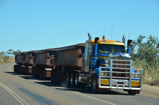 Da sich in diesem Gebiet auch viele Minen befinden, kreuzen immer wieder riesige Roadtrains unseren Weg.