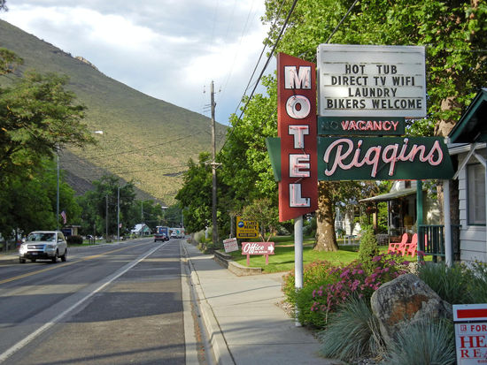 Gegen 17 Uhr sind wir im Riggins Motel, nach 10 Stunden, 317 Meilen (510 km). Das Hotel steht leider zum Verkauf.