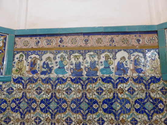 The attractive Moshtari-ye Moshtaq Ali Shah is the mausoleum for Sufi mystic Moshtaq Ali Shah, and other Kerman notables. Moshtaq Ali Shah was renowned for his singing and ability with the setar (a four-stringed instrument), and is apparently responsible for adding the fourth string to the setar (which literally means 'three strings'). He eventually fell so far out of favor with the local religious community that he was stoned in the Jameh Mosque. Most of what you see, including the prominent blue-and-white-tiled roofs, are from the late Qajar period.
