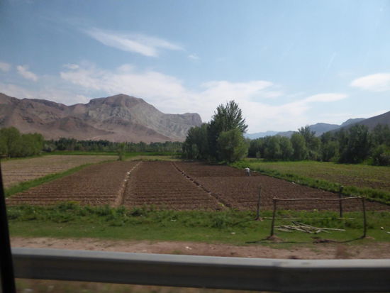 Standardabfahrtszeit scheint 8.30 Uhr zu sein. Sami kündigt Regen an; wir fahren aber bei strahlendem Sonnenschein ab. In nordwestlicher Richtung geht es entlang einer Bergkette von überwiegend rotem Gestein in die Provinz West-Azerbaidschan. Alles schillert bunt. Bei Suffiyan fahren wir an einer Karawanserei vorbei, die auf dem Rückweg besser beleuchtet sein müsste. Gegen 11.00 Uhr erreichen wir Qara, wo wir die erste Pause (Tanken und ...) einlegen. Von dort sind es noch einmal 120 km bis zum Ziel, allerdings nicht mehr über Autobahn oder autobahnähnlich sondern über normale Landstraße. Die Landschaft wird etwas karger, trotzdem wird Ackerbau betrieben.