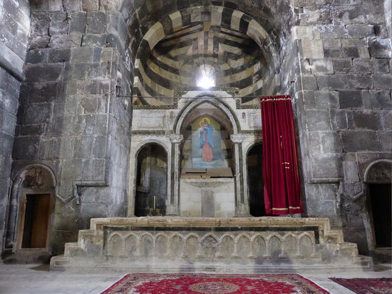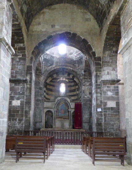 Wir verziehen uns wie schon in Ardebil ins Innere des Gebäudes, wo man deutlich zwischen früh (schwarzes Gestein) und spätem Kirchenbau (heller Sandstein) unterscheiden kann.