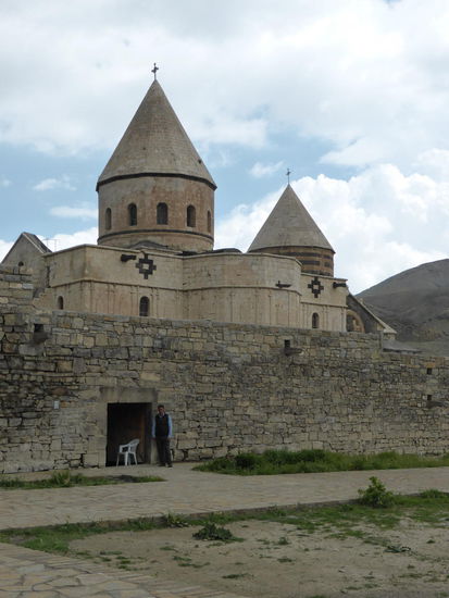 Gegen 12.30 Uhr erreichen wir dann die Thaddäus-Kirche - Qarah Kelisa = Schwarze Kirche - genannt. Schon von weitem erkennt man die beiden kegelförmigen Türme - Gottlob in der Sonne, die sich allerdings beim weiteren Annähern allmählich verzieht.