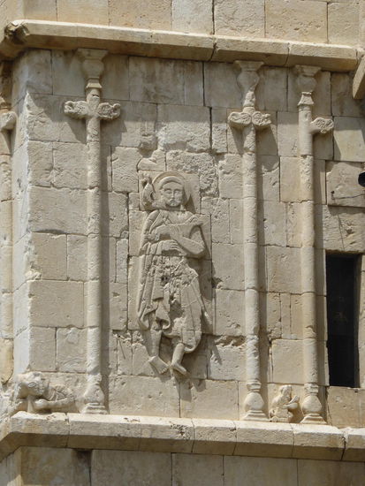 Die Außenwände der Kirche sind sehr unterschiedlich gestaltet. Während die Fassaden des älteren Baus bis auf Flechtmuster relativ schmucklos sind, ist der neuere Teil durch Felder und Blendnischen gegliedert, die überwiegend mit Pflanzenornamenten und Tier- und Heiligendarstellungen in Flachrelief geschmückt sind. So sind die herrlichen Zierbänder und Kartuschen an der Aussenfassade der jüngerern Bauteile deutlich zu sehen.
