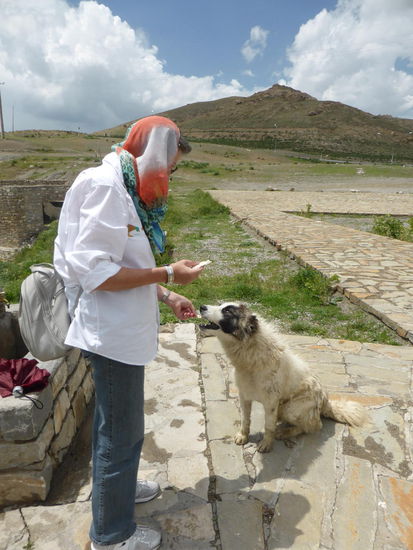 Nach der Besichtigung kramen Sami und Ali wieder die Picknicksachen aus dem Wagen und auf der Klostermauer gibt es dann ein Schälchen einer leckeren Sauce mit 'sardischem' Brot - auch der Hirtenhund kann die großen Platten maßgenau teilen. Danach gibt es Wassermelone und Datteln, sowie Kaffee und Kekse.
