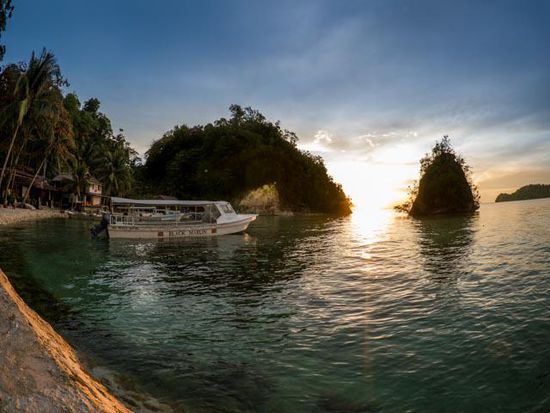 Diese Fahrt dauerte 10 Stunden und wir fuhren mit einem Auto, welches wir uns mit Einheimischen teilten. In Gorontalo verbrachten wir eine Nacht und am nächsten Abend bestiegen wir die Nachtfähre. Die Fähre war nicht unbedingt das neuste Modell und sah auch nicht wirklich hochseetauglich aus. Da das Wetter jedoch ruhig war, war die 12 Stündige überfahrt kein Problem. Wir hatten eine Kabine zum schlafen und so verging die Nacht ziemlich schnell. Am nächsten Morgen erreichten wir Wakai auf den Togian Inseln. Eine kleine Inselgruppe fern ab von jeglicher Zivilisation. Wir fuhren zum Black Marlin Dive Resort auf der Insel Khadiri. Ein wirklich schönes und einfach Resort, mit Bungalows welche wirklich direkt am Strand stehen. Hier trafen wir auf ein paar weitere reisende aus Belgien, Österreich, Deutschland und sogar ein ukrainisches Paar. Eine angenehme Gruppe Menschen. Wir verbrachten hier 5 wunderschöne Tage, an denen das relaxen im Vordergrund stand. Natürlich machten wir auch ein paar Tauchgänge. Man muss jedoch sagen, dass man wegen dem Tauchen den Aufwand hierher zu fahren nicht auf sich nehmen muss. Die Riffe sind praktisch Fischleer, da das Bomben fischen leider seine Spuren hinterlassen hat. Auch die Korallen sind nicht wirklich schön. Der einzige Tauchplatz der sich wirklich lohnt, ist die Insel Una Una, welche ca. 1 ½ Fahrstunden weg liegt. Da haben wir 2 Tauchgänge gemacht welche sich sehen lassen können.