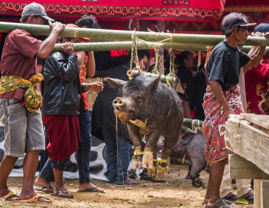 An jenem ersten Morgen, brachte uns unser Führer zu einer Beerdigung. Wir brachten Geschenke mit, und wurden von der Familie freundlich empfangen. Wir konnten uns hinsetzten und uns wurde Tee und Gebäck angeboten. Es war ein spezielles Gefühl sich mitten in einer Beerdigung von fremden Personen zu befinden, aber das gehört hier dazu. Zu Ehren des Verstorbenen werden dann auch immer Tiere geopfert. An dieser Beerdigung wurden insgesamt 15 Wasserbüffel und ca. 120 Schweine geopfert. Auch das ist für uns speziell, werden doch die Tiere mitten auf dem Gelände der Beerdigung geopfert. An diesem Tag bekamen wir mit wie die Schweine geopfert wurden. Das quicken der panischen Tiere ist nichts für schwache Nerven. Die Schweine werden mit einem gezielten Stich ins Herz getötet und sterben dann innerhalb ca. 1 Minute.