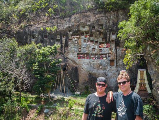 Nach der Beerdigung erkundeten wir mit dem Führer weiter die Umgebung von Toraja. Er führte uns zu den Gräbern der Verstorbenen. Für diese speziellen Gräber und den Totenkult ist die Region bekannt. Die Gräber werden in Felswende gehauen, wo der Sarg der Toten dann hineingeschoben wird. Dann wird das Grab, wo manchmal mehrere Familienmitglieder zusammen liegen verschlossen. Davor werden dann grosse Puppen von den verstorbenen auf Balkonen vor den Gräber platziert. Wir haben an diesem Nachmittag verschieden Grabstätten, zum Teil auch von hochrangigen Familien besucht. Ausserdem haben wir dann noch Gräber von Babys besucht. Diese werden nicht in Höhlen begraben. In einen grossen Baum werden Löcher gemacht, wo dann das verstorbene Baby hineinkommt. Danach wir das verschlossen, und im Laufe der Jahre wächst das Grab so zu. In einigen Bäumen wurden bis zu 30 Babys begraben. Ausserdem sahen wir auch noch die traditionellen Toraja Häuser, für welche die Region ebenfalls bekannt ist. Es war ein sehr interessanter Tag. Wir fuhren den ganzen Tag mit den gemietet Rollern durch die sehr schöne Landschaft, mit Reisfeldern und vielen traditionellen Dörfern.