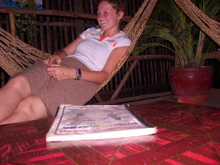 Vorher wurde ich aber von dem Hotelfahrer zu nem richtig schoenen einheimischen Lokal gebracht. Es gab keine Stuehle sondern um jeden Tisch hingen drei Haengematten. Das ganze war rund rum offen und stand ca. 5m hoch auf Bambusstelzen, zum schutz vor der Flut.