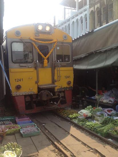 Am nächsten Tag fuhr ich endlich mal zum Trainmarket. Für alle die es nicht wissen. Bereits im letzten September als ich in Bangkok war versuchte ich vergeblich dort hinzukommen. Die Infrastruktur dorthin ist nicht besonders gut, deshalb versuchte ich diesmal mein Glück mit einer Reisegruppe und es klappte endlich. Der Trainmarket ist wirklich sehr verrückt. Da die Einheimischen auf dem Gelände der Bahn keine Standmiete zahlen müssen entstand dieser Markt. Auf einer Länge von etwa 300 Meter werden Fisch, Fleisch, Gemüse und Obst direkt neben den Schienen angeboten. Nach einer halben Stunde dann auf einmal Hektik. ,,The train is coming!“ höre ich einen Einheimischen rufen, alle Marktleute klappen ihre Schirme ein und räumen das Feld. Keine Minute später sieht man den Zug der sich zwar langsam aber dennoch mit geschätzten 10 km/h durch den Markt bewegt. Unbeschreibliches Gefühl direkt neben einem fahrenden Zug zu stehen. Kaum ist der Zug weg, geht das Marktleben weiter.
