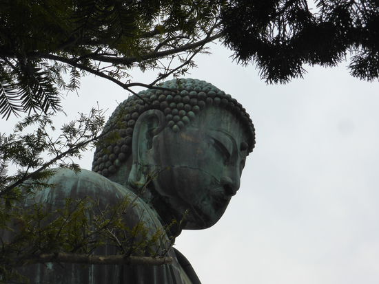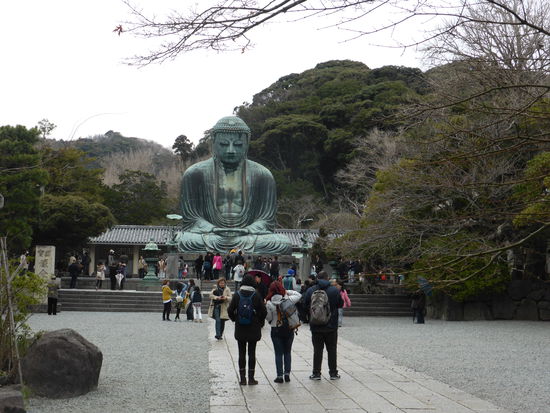Wie bereits auf der Schautafel zu sehen ist, gilt unser erster Besuch dem Kōtoku-in mit der ab 1252 errichteten monumentalen Bronzestatue des Amida-Buddha, gewöhnlich „Daibutsu“ genannt. 1498 zerstörte ein Tsunami den ungefähr 860 m vom Strand entfernten Tempel und die den Großen Buddha umgebende Halle, seitdem steht die Figur frei.