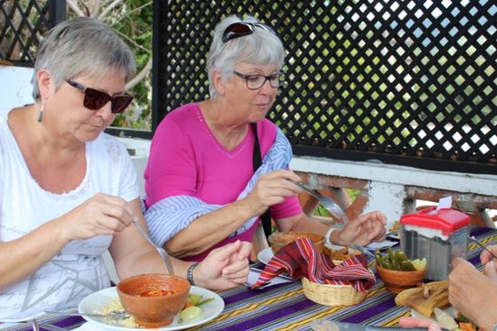 Während wir unten noch überlegen, was wir essen wollen und uns das eine oder andere in unsere Teller schöpfen lassen, haben die Kellner oben auf dem Dach einen langen Tisch für uns bereitgestellt. So können wir unser Essen über den Dächern der Stadt, mit Aussicht auf den Vulkan geniessen. Dieser versteckt sich zwar heute meist hinter Wolkenschleiern.