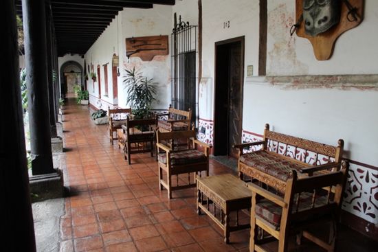 Es ist früher Nachmittag, darum sind unser Zimmer noch nicht bereit und René startet gleich zur Stadtführung. Klöster und Kirchen stehen heute auf dem Programm und wir starten bei Santo Domingo, einem ehemaligen Dominikanerkloster. Es wurde bereits im 18. Jahrhundert durch ein Erdbeben zerstört und 1989 als Hotel eröffnet. Es ist das einzige 5*-Hotel und wahrscheinlich das schönste von ganz Zentralamerika. Die modernen Zimmer wurden sorgfältig in die bestehenden Mauern eingebaut, Brunnern und Höfe wurden möglichst original belassen.