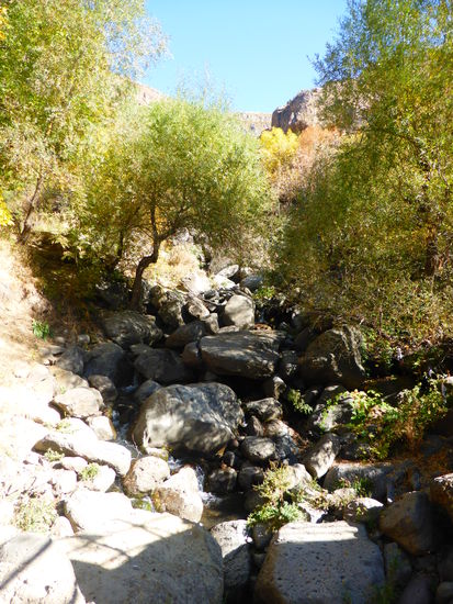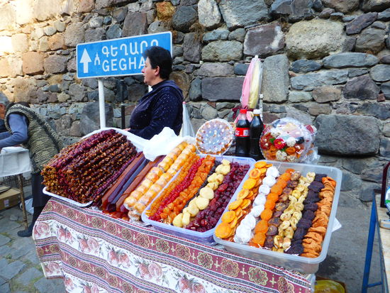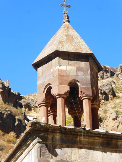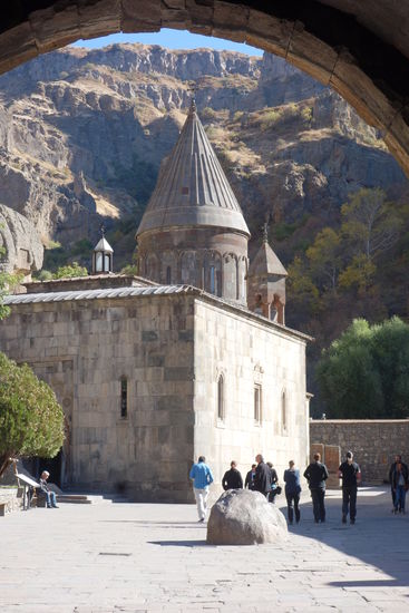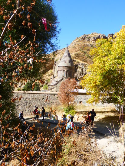 Nach dem ausführlichen Fotostopp geht es weiter über Garni in die Schlucht von Geghard – der obligatorische Fotostopp hier findet etwas zu früh statt, denn die Sonne ist noch nicht so hochgestellt, dass das malerisch in der Azat-Schlucht liegende Kloster vollständig beschienen ist.