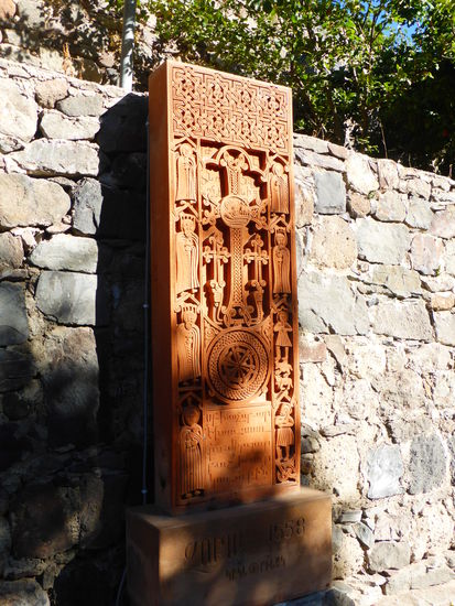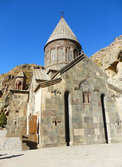 An einer bekannten heidnischen Kultstätte hat man vermutlich im 4. Jh. bereits ein erstes Höhlenkloster gegründet. Eine wechselvolle Geschichte mit Plünderungen durch Araber, mit Legenden von der heiligen Lanze eines Apostels, als Privatbesitz einer Familie Poschjan im 14. Jh zeugt von zahlreichen Gebäuden.