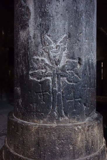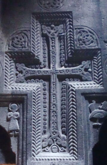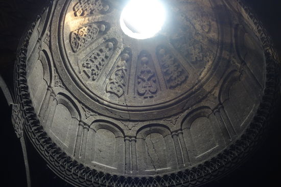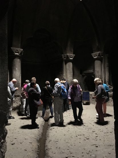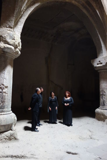 Die zweite Felskirche und ihr Gavith wurden 1283 gebaut und sind über die Nordostseite des großen Gavith zu begehen Auch diese beiden Felsgebaude sind etwas nach Norden gedreht Sie waren gänzlich als Grabstätten der Prosch|an bestimmt, deren Gräber sich in den steinernen Boden des Gavith eingelassen befinden. In der zweiten Höhlenkirche kann ich sogar einen kurzen Clip drehen, denn drei Gläubige stehen dort und singen Kirchenlieder.