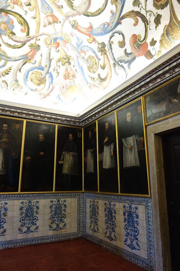 Wundervoll ist die Kassettendecke mit ihren gleichmäßigen, vertieften Feldern aus dem 17. Jahrhundert, ein Werk von Jacinto Pereira da Costa. Unterstrichen wird die Würde des Saales durch die großformatigen Herrschergemälde