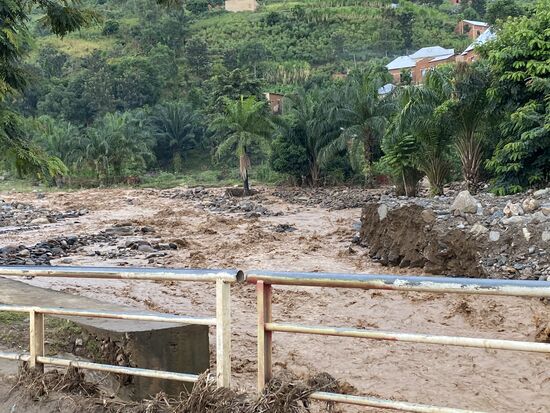 Oben in den Bergen hat es starke Regenfälle gegeben und das Wasser kommt nun von den Bergen runter. In Flüssen und Bächen. Und alles wird überschwemmt.